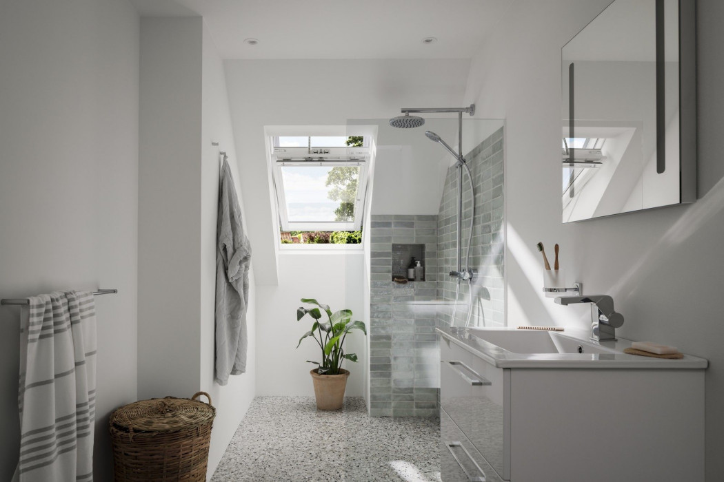 W jasnej łazience lub kuchni liczy się światło i odporność na wilgoć. Trzyszybowe elektryczne okna dachowe VELUX GLU z białym, gładkim wykończeniem harmonijnie wpisuje się w nowoczesne aranżacje. Połączone z systemem do sterowania klimatu VELUX Active automatycznie dba o dopływ świeżego powietrza, reagując na warunki w pomieszczeniu, a jego trwała powierzchnia zachowuje estetykę nawet w wymagających wnętrzach.
