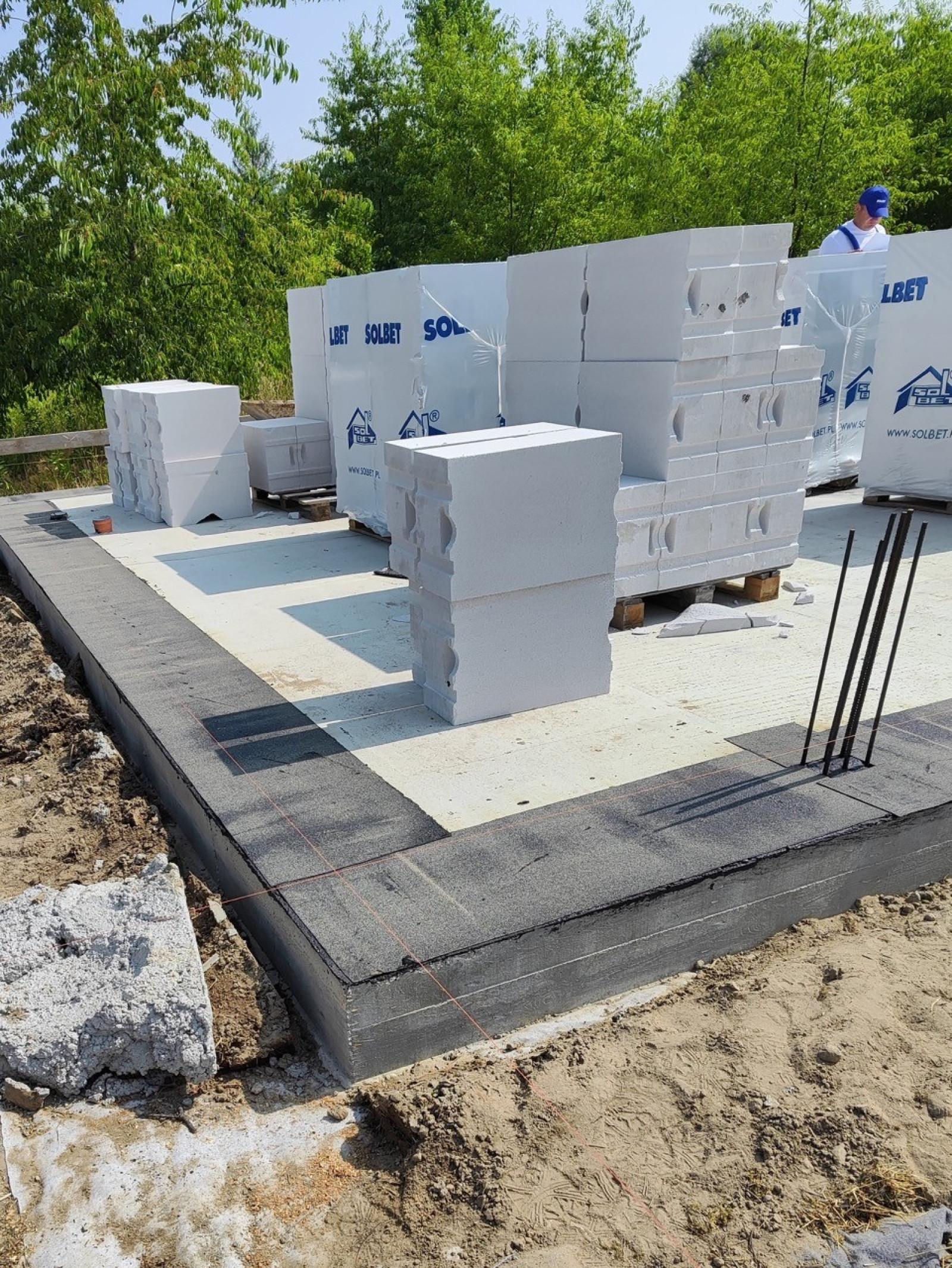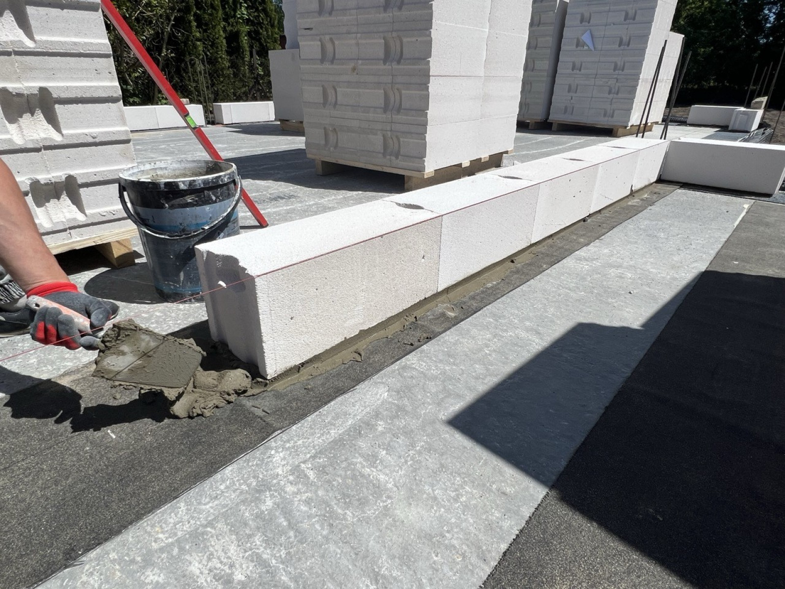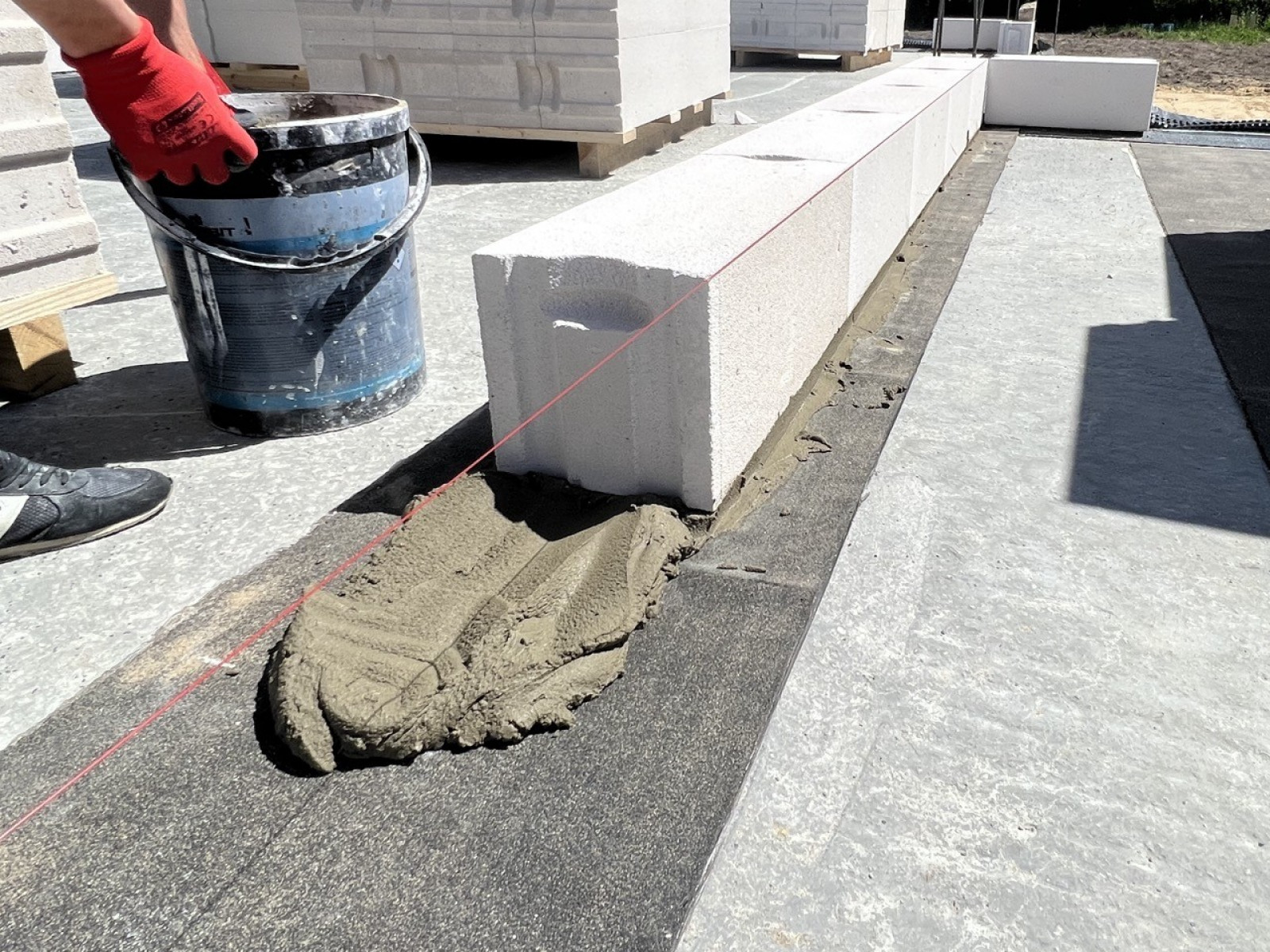 Murowanie pierwszej warstwy jest etapem, który wymaga największej dokładności. Zarówno podłoże, jak i izolacja muszą być odpowiednio przygotowane, a bloczki wypoziomowane. Staranność na tym etapie zaprocentuje przy murowaniu kolejnych warstw bloczków - muruje się szybciej, a ściany są równe i trwałe.
