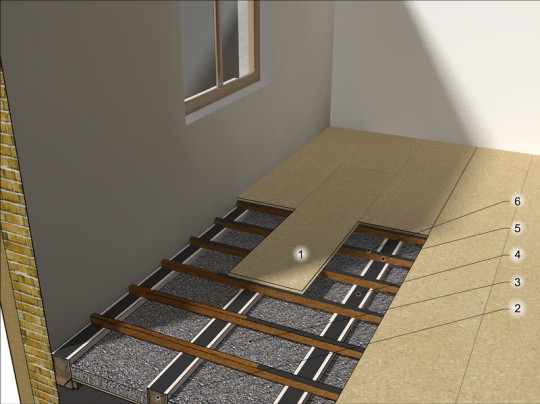 Kolejnym krokiem jest położenie legarów i warstwy podłogowej. Legary to z reguły elementy drewniane o wymiarach 4x6 lub 6x6cm. Ich rozstaw uzależniony jest od dwóch rzeczy: po pierwsze od grubości wybranej płyty mfp® (maksymalne rozstawy w zależności od grubości płyty znaleźć można na stronie producenta), po drugie od jej wymiarów (łączenia krótszych boków płyty zawsze powinny wypadać nad legarem). Pamiętać należy również, aby w żadnym wypadku nie mocować rusztu pośredniego (legarów) do belek stropowych. Powinny one swobodnie leżeć na przekładkach izolujących.