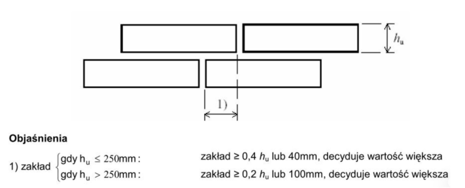 - Dla elementu murowego o wysokości do 250 mm przewiązanie powinno wynosić 0,4 wysokości elementu murowego i nie mniej niż 40 mm, natomiast dla elementów murowych o wysokości większej niż 250 mm przewiązanie powinno wynosić 0,2 wysokości i nie mniej niż 100 mm (patrz rys. 2).