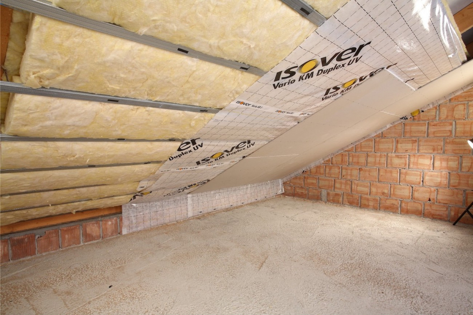Kolejnym krokiem jest zamocowanie do wieszaków profili nośnych i wypełnienie tak przygotowanego rusztu drugą warstwą wełny, np. grubości 15 cm. Jej zadaniem jest osłonięcie elementów nośnych więźby dachowej. Dzięki temu w miejscach tych nie będą powstawały mostki termiczne. Następnie ocieplenie osłania się folią paroizolacyjną, a na końcu wykańcza się skosy - z reguły płytami g-k, analogicznie jak w sposób opisany wyżej.
