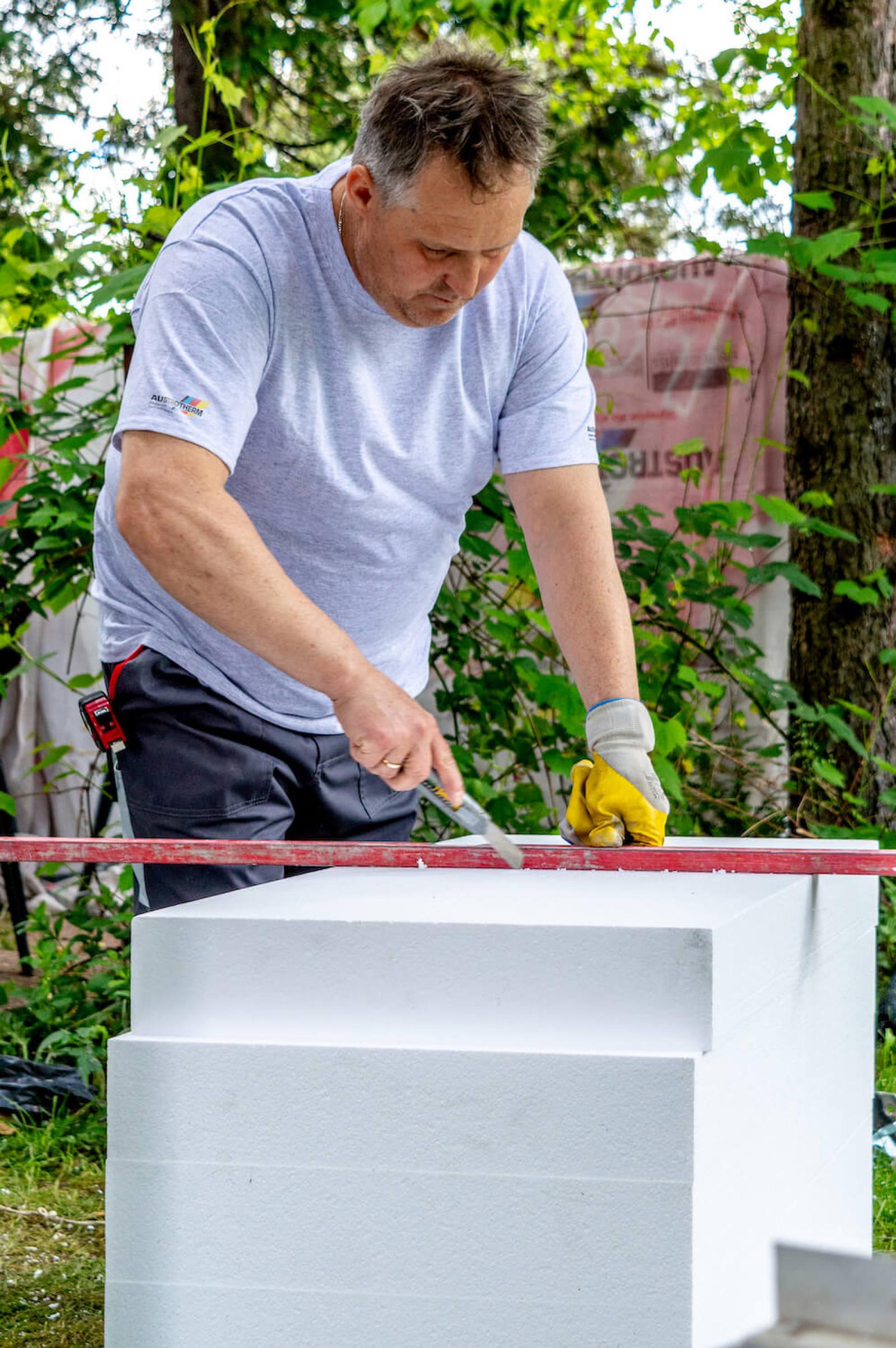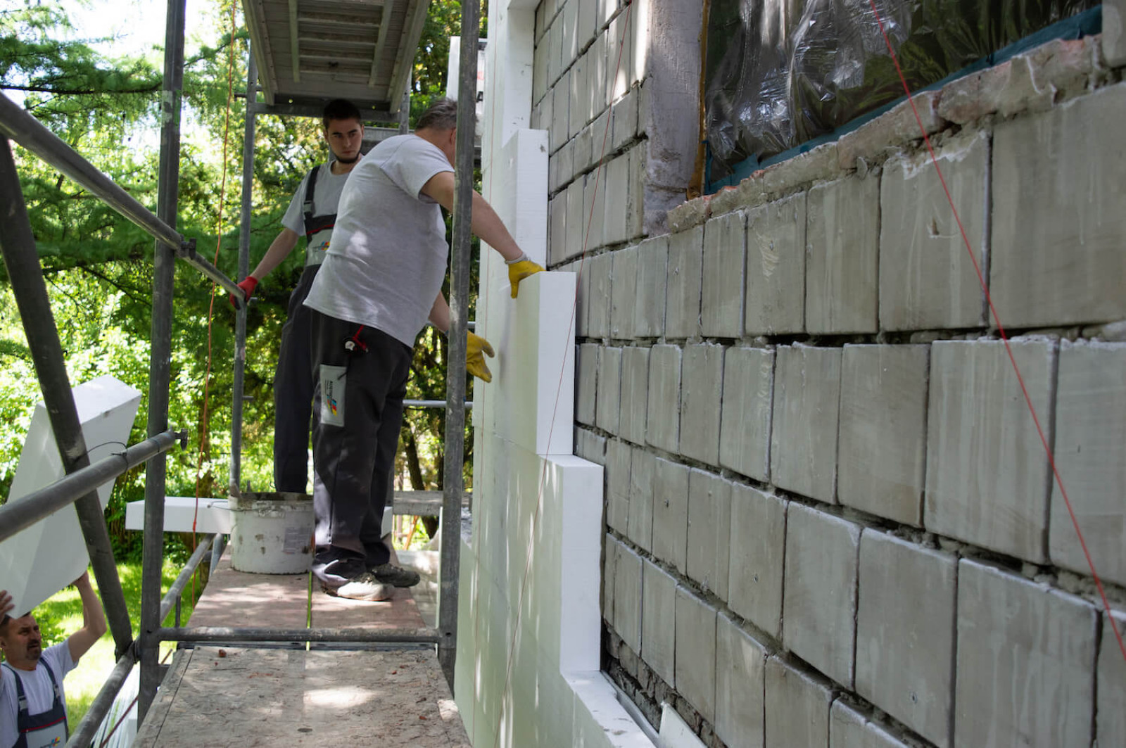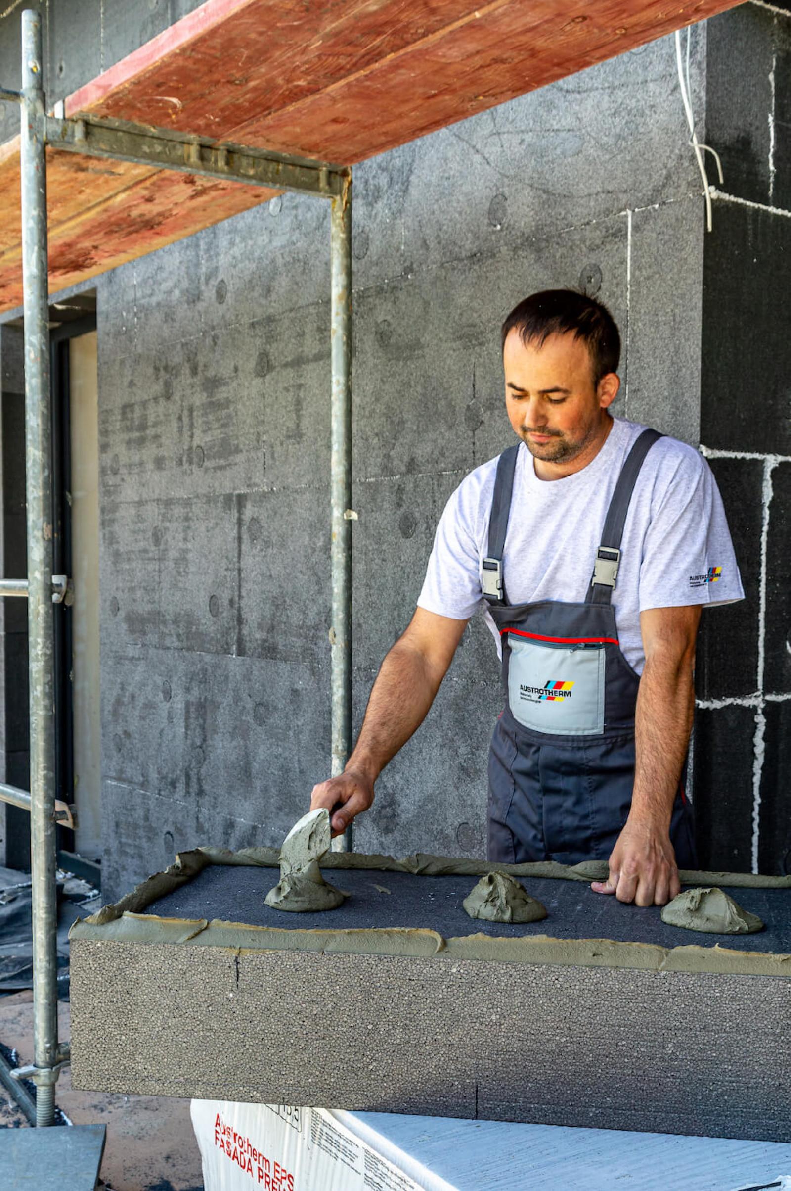 Trwałość i skuteczność izolacji zależą nie tylko od wyboru odpowiedniego styropianu, ale też jego fachowego zamontowania. Przyjrzyjmy się, jak to wygląda w przypadku ścian, których ocieplenie budzi najwięcej emocji wśród osób budujących domy. Najlepszy czas na ocieplanie ścian styropianem to późna wiosna, początek lata lub jesień, czyli okresy o umiarkowanej temperaturze. Powinna się ona mieścić w zakresie 5–25°C, bo zarówno zimno, jak i upał, mogą negatywnie wpływać na proces schnięcia tynków, obniżając ich przyczepność oraz ogólną wytrzymałość. Prawidłowemu wykonaniu ocieplenia może również zaszkodzić silny wiatr. Po dostarczeniu styropianu na plac budowy konieczne jest jego zabezpieczenie przed wilgocią i promieniowaniem UV. Jeżeli używany jest styropian szary bez warstwy ochronnej, należy go chronić podczas montażu, np. osłaniając specjalną siatką przeciwsłoneczną, która zapobiegnie nadmiernemu nagrzewaniu się materiału.