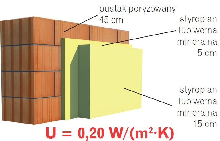 Ściana dwuwarstwowa z pustaków poryzowanych i styropianu lub wełny mineralnej przed i po dociepleniu od zewnątrz