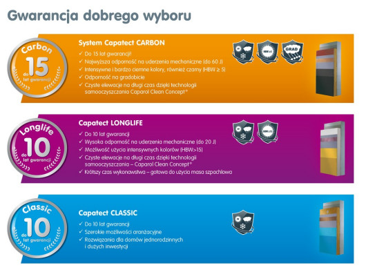 O trwałości decydują efektywne rozwiązania chroniące ściany budynku - kombinacja wytrzymałej warstwy zbrojonej i tynku. Duże znaczenie mają również walory estetyczne. Systemy Capatect oferują szeroką gamę barw i różnorodnych efektów dekoracyjnych.