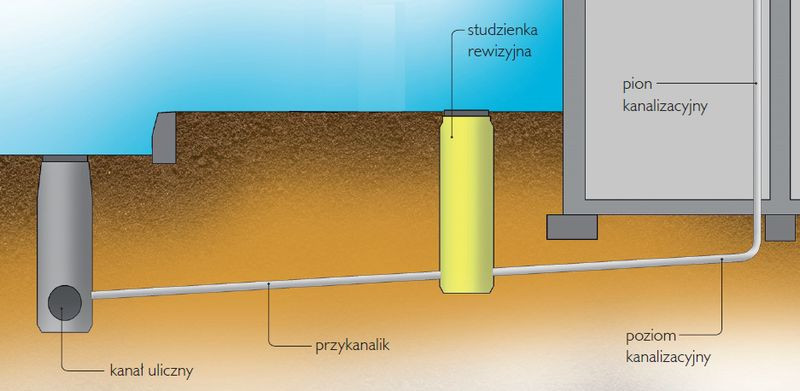Rury kanalizacyjne mają dużą średnicę (100–150 mm) i trzeba prowadzić je ze spadkiem min. 2% w kierunku odpływu. Układać więc je trzeba na etapie robót fundamentowych. Już wtedy warto rozplanować w przyszłym domu rozmieszczenie urządzeń sanitarnych tak, aby ścieki dało się odprowadzić możliwie najkrótszą drogą. Odpływową rurę kanalizacyjną doprowadzamy zawsze w pobliże miski ustępowej w taki sposób, by na jej końcu można było dołączyć rury odpowietrzające lub podłączyć pion kanalizacyjny wyżej położonej kondygnacji. W rozległych domach węzły łazienki i WC mogą być tak oddalone, że budynek będzie wymagał 2–3 rur łączących instalację domową z główną rurą odpływową poza budynkiem.
