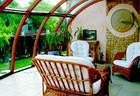 Taki przytulny salon możemy zaaranżować w ogrodzie ogrzewanym,