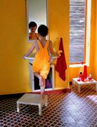 | Dla juniora dla seniora Gdy w domu są dzieci lub osoby starsze warto wyposażyć łazienkę w dodatkowe elementy, które im ułatwią, a czasem wręcz umożliwią, samodzielną toaletę. Małym dzieciom można przed umywalką ustawić stabilny podnóżek, który umożliwi mycie rączek. Taki sam podnóżek, plus specjalna nakładka ze zmniejszonym otworem, ułatwi korzystanie z WC. Wszystkie gniazdka elektryczne, oczywiście przystosowane do pomieszczenia o podwyższonej wilgotności (dodatkowo zabezpieczone klapką), warto zamontować na takiej wysokości, by znalazły się poza zasięgiem małych dzieci. Zapewnienie bezpieczeństwa seniorom lub osobom mniej sprawnym wymaga przemyślanych rozwiązań. Przede wszystkim trzeba pomyśleć o łatwym dostępie do łazienki. Do obowiązkowego wyposażenia łazienki "specjalnego przeznaczenia" należą uchwyty naścienne. Przy sedesie trzeba je zamontować na wysokości 65-75 cm, by umożliwiały wstawanie i siadanie. Przy prysznicu sprawdzają się pionowe poręcze długości od 30 do 60 cm, przymocowane tak, by ich środek znajdował się 100-125 cm od podłogi. Amatorom kąpieli w wannie zaleca się ustawienie przy niej stabilnego podestu równego jej wysokości lub wpuszczenie nieco wanny w podłogę. Do kabiny prysznicowej warto wstawić składane krzesełko. Szykując łazienkę dla osób poruszających się na wózku trzeba pamiętać o zainstalowaniu szerszych drzwi. Nie bez znaczenia jest wysokość, na jakiej znajdzie się sedes. Jego krawędź powinna być oddalona od ściany o ok. 70-75 cm, co umożliwi ustawienie wózka równolegle do jego boku. Ważna jest jego wysokość - jeżeli będzie to 50-52 cm, niepełnosprawny będzie mógł opierać stopy o podłogę. Jak najbliżej sedesu montujemy umywalkę, najlepiej prostą, nie mniejszą niż 60x45 cm. Jej górna krawędź powinna znaleźć się na wys. 80-85 cm, dolna nie niżej niż 67 cm od podłogi - dzięki takiemu jej usytuowaniu wystarczy miejsca na wózek. W każdej łazience, nie tylko tej z której korzystają dzieci lub seniorzy, podłogę warto wyłożyć płytkami antypoślizgowymi albo specjalnym gresem. Dyskretne pranie Jeżeli to tylko możliwe na pralnię i suszarnię przeznaczmy oddzielne pomieszczenie gospodarcze. Czasami jednak pralkę musimy zamontować w łazience - możemy ją wówczas dyskretnie ukryć lub wręcz przeciwnie - wyeksponować model dopasowany stylistycznie do wnętrza. Wybór pralki musi uwzględniać wymiary pomieszczenia - nie bez znaczenia będzie tu sposób jej ładowania (od góry czy od przodu), gdyż modele te różnią się wymiarami; ładowana od góry jest zazwyczaj węższa. Ładowanej od przodu trzeba zapewnić wolną przestrzeń przed nią, aby można było ją wygodnie obsługiwać, natomiast nad ładowaną od góry nie będzie można powiesić szafki czy półek. Doskonałym miejscem dla pralki jest wnęka, którą łatwo zasłonić (np. drzwiami suwanymi, składanymi lub roletą) lub sąsiedztwo umywalki - pod wspólnym blatem. Pamiętajmy o wygodzie Myśląc o tym, jak uczynić łazienkę piękną, nie zapominajmy o tym, jak ważną rzeczą jest łatwość utrzymania jej w czystości: