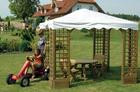 Pawilony mogą być też na stelażu drewnianym. W wielu przypadkach konstrukcja podtrzymująca dach opiera się na kratownicach, umocowanych do drewnianych donic. Takiego pawilonu nie schowamy na zimę, dlatego dach może być wykonany z trwałego materiału. Stąd już tylko krok do altany...