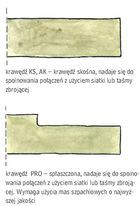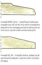 Najpopularniejsze są płyty z krawędziami zaokrąglonymi KPOS (VARIO, HRAK) przeznaczonymi do zbrojenia siatką lub taśmą, ale spoinę można też wypełnić masą niewymagającą zbrojenia 2. Jeśli zastosuje się siatkę lub taśmę samoprzylepną, wystarczą dwie warstwy masy szpachlowej. Krawędzie ścięte KS (AK) przeznaczone są do zbrojenia siatką lub taśmą. Niezależnie od rodzaju wzmocnienia, spoiny wykańcza się trzema warstwami masy szpachlowej. Połączeń płyt o prostych krawędziach KP zazwyczaj się nie zbroi. Krawędzie PRO (z wyciętymi wgłębieniami) można zbroić siatką, ale najlepiej sprawdzają się materiały samoprzylepne, np. taśmy. Wówczas spoinę wykańcza się dwiema warstwami masy szpachlowej. Do wykończenia płyt o wgłębieniach ok. 1 mm, potrzeba mniej zaprawy niż do wykończenia płyt o innych rodzajach krawędzi.