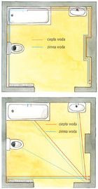 Dużo łatwiejsza do rozplanowania jest instalacja wodociągowa. Podejścia do baterii mogą być prowadzone w dowolny sposób i nie wymagają precyzyjnego ustalenia (wystarczy kilkucentymetrowa dokładność), gdzie będą zamontowane przybory sanitarne. Jedynie przy planowaniu miejsc podłączeń baterii naściennych do wanny i brodzika, trzeba bardzo dokładne określić wysokość wyprowadzenia rur oraz ich rozstawienie.