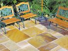 Kamienne płyty w piaskowych barwach tworzą efektowną całość z ciekawymi meblami z metalu i drewna (fot. Libet)
