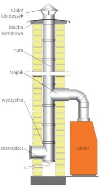 Komin murowany, w którym ma być zamontowany stalowy wkład kominowy, trzeba rozkuć w dolnej jego części tak, by można było połączyć kocioł z trójnikiem wkładu oraz zamontować na dole wkładu wyczystkę z odkraplaczem.