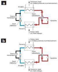 3 Schemat działania odwracalnej pompy ciepła w trybie: ogrzewania (a), chłodzenia (b)