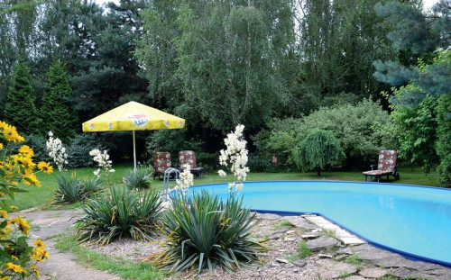 Strefę wypoczynkową przy basenie otacza gęsta roślinność