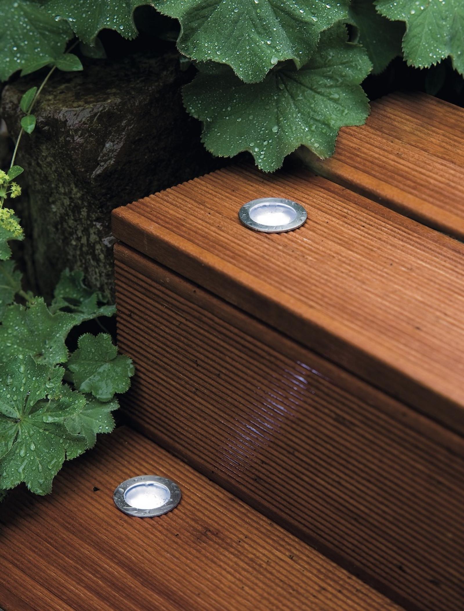Także schody zewnętrzne dobrze jest oświetlić lampkami montowanymi w stopniach. Należy stosować w nich źródła światła o małej lub średniej mocy, inaczej mogą razić przechodzące osoby. Producenci oferują spory wybór opraw tego typu - m.in. wersje okrągłe i kwadratowe. Hermetyczna stalowa obudowa zapewnia wytrzymałość na nacisk kół oraz na zalanie.
