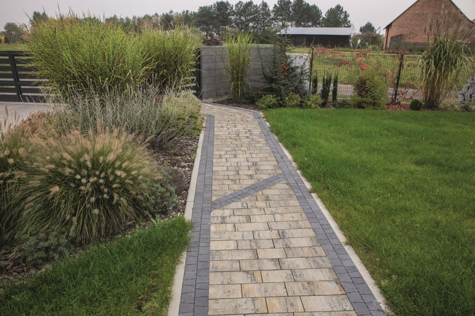 Brzegi brukowanych ścieżek wokół domu, podjazdów i tarasów umacnia się krawężnikami, wykonanymi najczęściej z betonu, pochodzącymi z tej samej kolekcji co kostka, fot. BRUK-BET