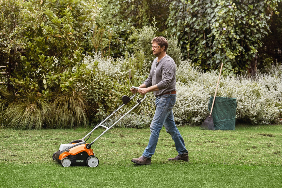 Konieczność wertykulacji trawnika zależy tylko od jego stanu: Delikatnie przeciągnij małe metalowe grabie po darni. Jeśli pozostaną na nich resztki po koszeniu, chwasty lub mech, warto napowietrzyć glebę wertykulatorem, aby oczyścić trawnik z filcu albo zapobiec jego tworzeniu. Dobrym wyborem jest wertykulator akumulatorowy, np. STIHL RLA 240.