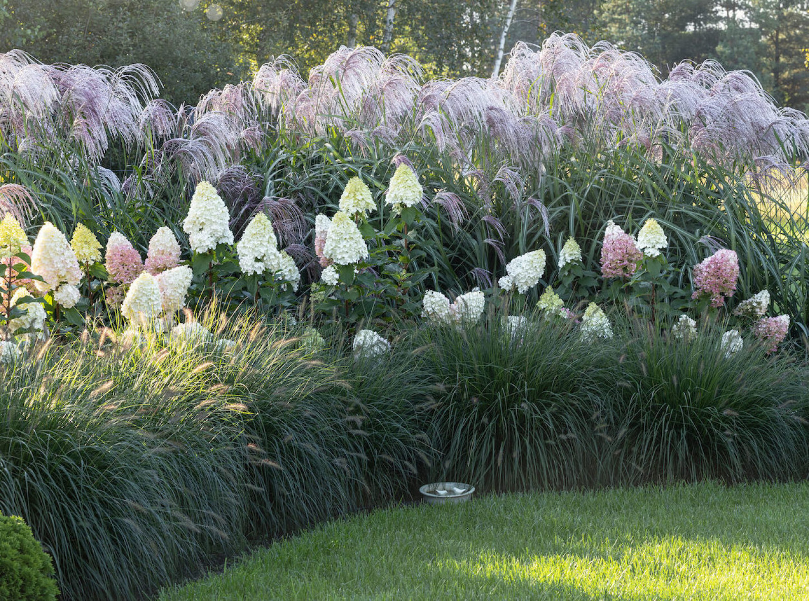 W większych ogrodach ładnie wyglądają trawy ozdobne posadzone w grupach, tu tworzą piękną kompozycję z hortensjami, fot. Adobe Stock