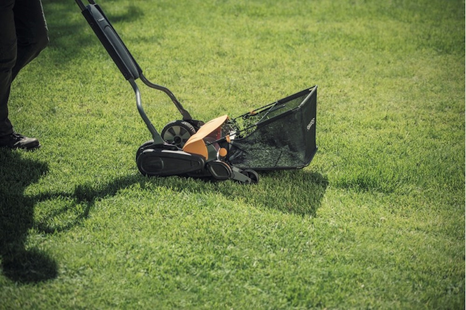 Kosiarki ręczne najlepiej sprawdzają się na małych, równych trawnikach. Bębnowy mechanizm tnący przycina źdźbła jak nożyce, dzięki czemu trawnik wygląda estetycznie i nie ma poszarpanych końcówek, fot. FISKARS