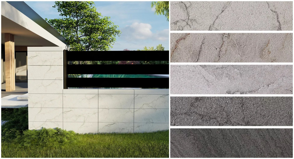 Linia NATURYT oferuje aż pięć wyjątkowych wariantów, które pozwalają dopasować ogrodzenie do charakteru domu i otoczenia: Marmur biały, Marmur szaro-beżowy, Marmur szary jasny, Kwarcyt stalowy