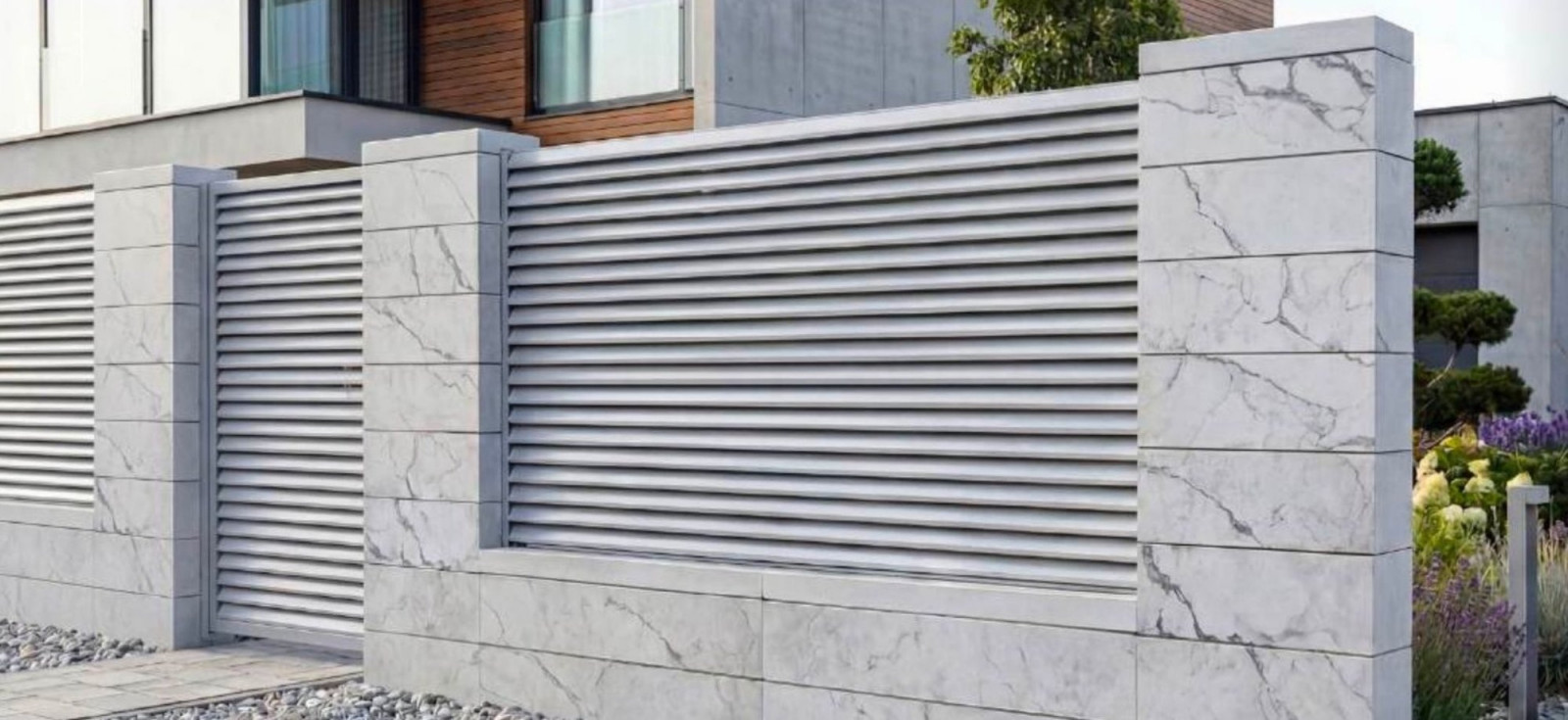 Kolor ogrodzenia powinien wynikać z charakteru domu i otoczenia. W minimalistycznych realizacjach najlepiej pracują jasne, czyste wykończenia. Marmur biały daje lekkość, porządek i dobrze współgra z prostą architekturą. Przy bryłach bardziej nowoczesnych i modernistycznych dobrze wyglądają chłodniejsze tony, zwłaszcza kwarcyt stalowy albo marmur szary jasny, bo podbijają współczesny charakter domu, ale nie wprowadzają zbędnej dekoracyjności.