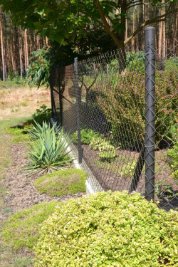 Na ocynkowanej siatce dopiero niedawno w paru miejscach pojawiła się rdza. Pomalujemy ją więc dopiero teraz i spodziewamy się, że bez konserwacji przetrwa kolejne 10 lat. Celowo nie naciągnęliśmy siatki u góry stalową linką – dzięki temu trudniej się po niej wspiąć, a spadające gałęzie pobliskich drzew tylko miejscowo ją odginają.