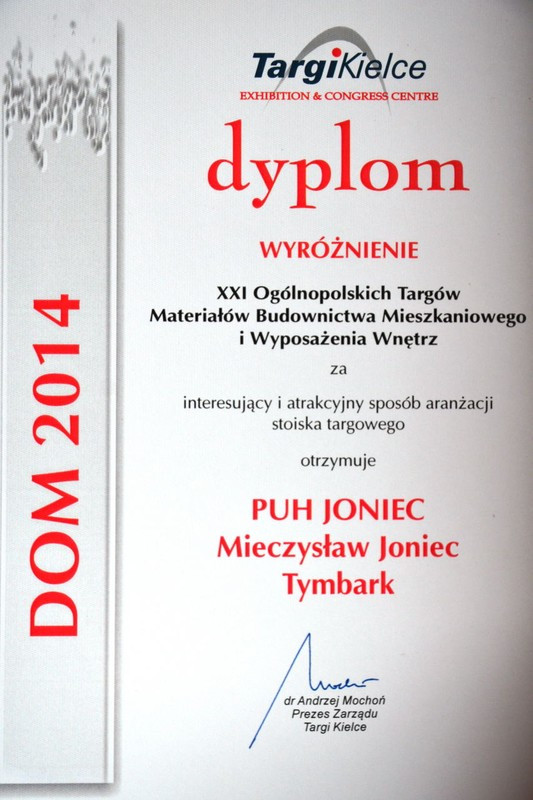 Firma JONIEC otrzymała Wyróżnienie i Dyplom za interesujący i atrakcyjny sposób aranżacji stoiska targowego. Wyróżnienie zostało przyznane przez Dyrekcję XXI Ogólnopolskich Targów Materiałów Budownictwa Mieszkaniowego i Wyposażenie Wnętrz DOM 2014.