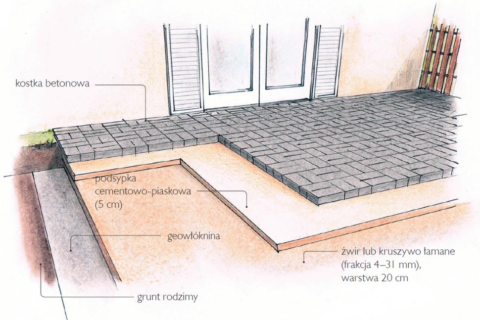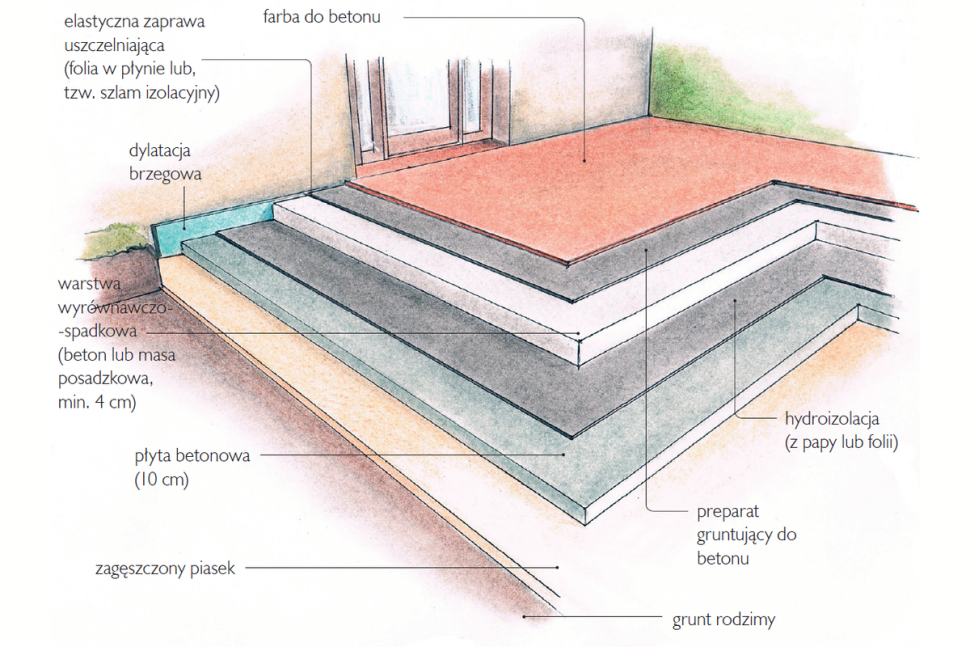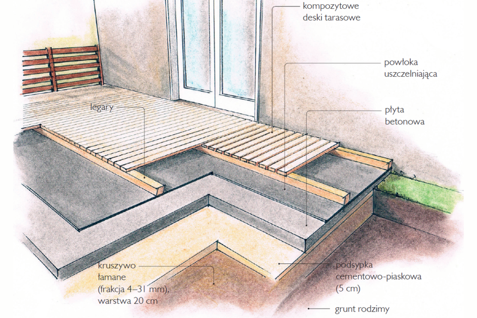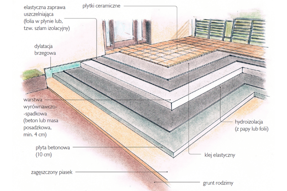Uwaga! Każdy taras musi mieć ok. 2% spadek od ściany domu w kierunku ogrodu, aby zapewnić odpływ wodzie opadowej.