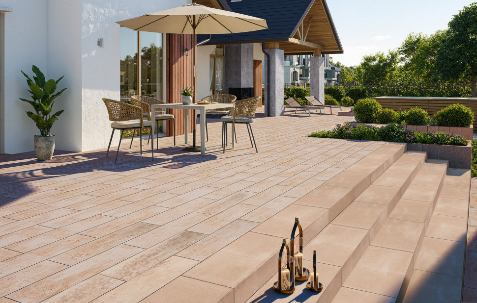 Barwa nawierzchni tarasu ma ogromny wpływ na charakter całej przestrzeni. Jasne beże, ciepłe brązy oraz neutralne tonacje szarości pojawiają się w projektach coraz częściej, ponieważ pozwalają dopasować taras do niemal każdej elewacji oraz zieleni ogrodu. Beżowa paleta, obejmująca odcienie takie jak Lumino, Platino czy Amaretto, tworzy przytulną, naturalną atmosferę i pięknie komponuje się z ogrodową roślinnością. Szarości, takie jak Grafit, Argento czy Inverno, wprowadzają z kolei elegancję, nowoczesność i wizualny spokój.