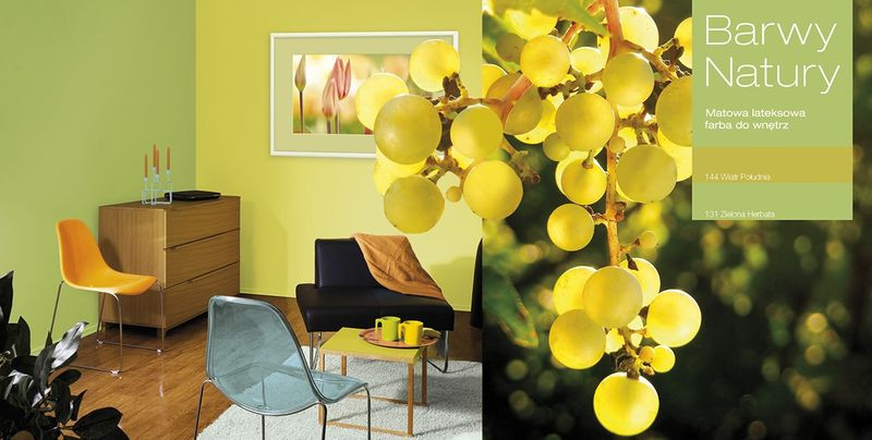 Jesień zdaje się także wprowadzać rewolucję w letnich kolorach – przyciemnia, rozjaśnia, gasi, a nawet całkowicie zmienia barwy natury. Nadchodząca pora roku zachwyca bogatą paletą odcieni, w szczególności barwy zielonej: złocące się, ale jeszcze zielone trawy, przebierające się jak kameleon liście drzew, czy soczyste winogrona w odcieniu zielonej herbaty, dojrzewające na południowych stokach winnic. Połączenie we wnętrzu "Wiatru Południa" z "Zieloną Herbatą" napełni nasz dom optymizmem, radością, a jednocześnie spokojem i poczuciem bezpieczeństwa.