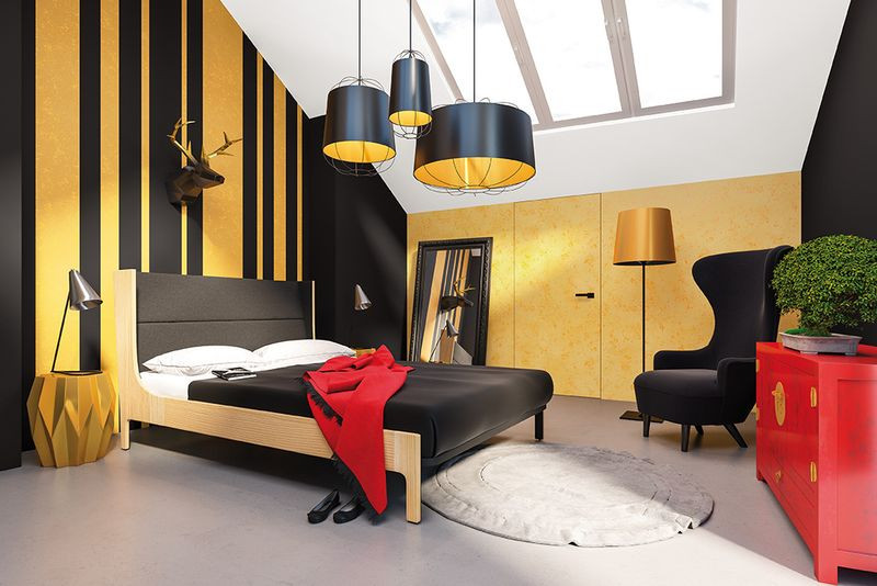 Oprócz tego wykorzystywane są również barwy metaliczne – srebro, złoto i miedź w formie efektownych systemów dekoracyjnych, jak np. Metallici, czy elementów wyposażenia. Jak najbardziej naturalne są tu również inspiracje pop-artem. Ażurowe meble z metalowych prętów, proste formy mebli z cienkimi metalowymi lub drewnianymi nóżkami, dodatki utrzymane w nurcie japońskiego origami, ciekawe parawany, dzielące przestrzeń na strefy funkcjonalne są nieodłącznym elementem pomieszczeń nastawionych na graficzne motywy i podziały.