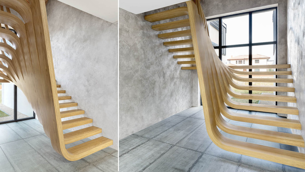Wyjątkowe schody wspornikowe wykonane w technologii drewna gięto-klejonego. Drewniane spływające wstęgi łączą stopnie na różnych poziomach tworząc organiczną rzeźbę przynoszącą na myśl miękkie linie występujące w naturze. Takie schody wymagają przestrzeni o określonych proporcjach, ich zastosowanie trzeba więc przewidzieć już na etapie projektowania domu.