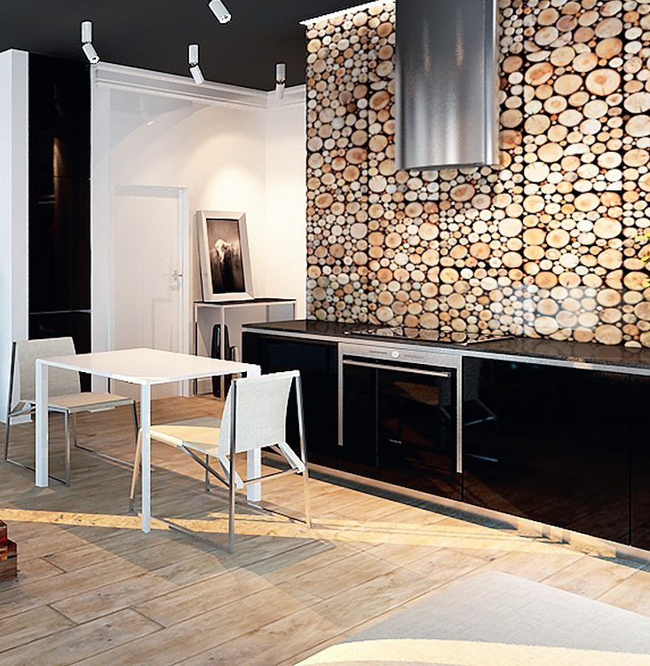 Naturalne drewno. Zwolennicy naturalnych materiałów mogą ściany wykończyć panelami z drewna. Każdy panel składa się z drewnianej płyty, do której przymocowane są pieńki z naturalnego drewna o grubości kilkudziesięciu milimetrów. Elementy drewniane są ręcznie układane, co gwarantuje unikalny wzór na każdym z paneli. Mogą być montowane zarówno w pionie, jak i w poziomie.