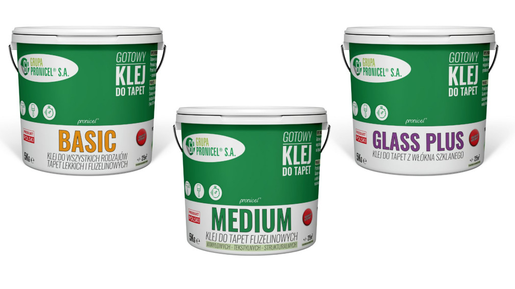 Marka Pronicel oferuje trzy wyjątkowe gotowe kleje do tapet: Basic, Medium oraz Glass Plus, które zostały stworzone z myślą o różnych rodzajach tapet i ich specyficznych wymaganiach.