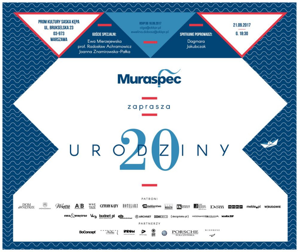 Na jubileuszowe obchody 20-lecia w Polsce firma Muraspec zaprasza partnerów biznesowych, architektów i projektantów wnętrz, przedstawicieli świata designu oraz mediów. Przewidziane są między innymi prezentacje, które poprowadzą Goście Specjalni Ewa Mierzejewska, redaktor naczelna czasopisma Dom & Wnętrze, prof. Radek Achramowicz, współzałożyciel marki Puff-Buff oraz Joanna Znamirowska-Pałka.
