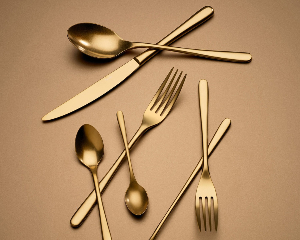 Wysokiej jakości sztućce LUI GOLD wykonane są ze stopu stali chromowo-niklowej 18/10. Ich forma jest wyrazem doskonałej równowagi między klasyką a nowoczesnością. Pokryte zostały bezpieczną dla zdrowia, cienką i trwałą powłoką PVD w matowym złotym odcieniu w stylu vintage. Sztućce te są znakomitym wykończeniem stołowej aranżacji, a dzięki użytym materiałom będą nam służyć przez długie lata.