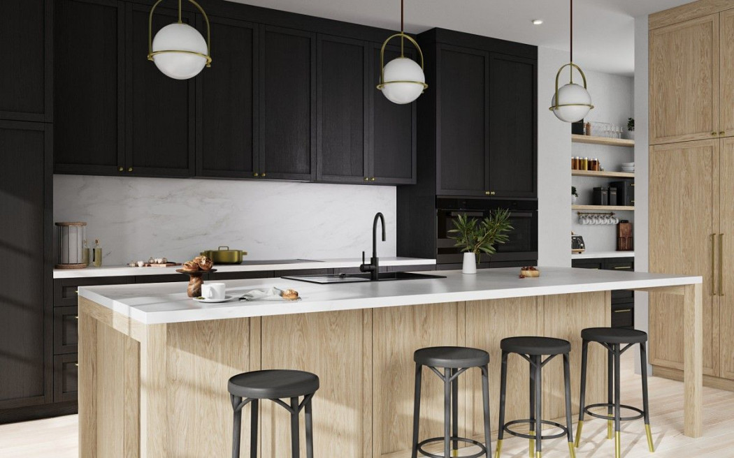 W baterii Zumba Nero w czerni utrzymany jest zarówno korpus, jak i elastyczna wylewka. Model wyposażony jest w regulator ceramiczny, który gwarantuje precyzyjne sterowanie wypływem wody i bezproblemowe użytkowanie. W prezentowanej aranżacji kuchennej Zumbę Nero zestawiono z czarnym zlewozmywakiem oraz czarną zabudową meblową. Ciemne elementy łagodzą jasne blaty oraz drewno, które pojawia się w części frontów mebli i podłodze.