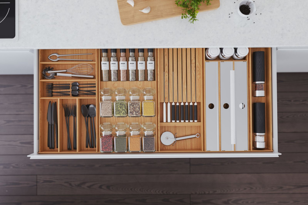 Wykonane z fornirowanej sklejki dębowej i pokryte matowym transparentnym lakierem wkłady do szuflad to funkcjonalny i gustowny przepis na uporządkowanie kuchennych akcesoriów i drobiazgów. Przeznaczone są do szuflad o gł. 500 mm (np. Slim Box). Linia obejmuje 5 modeli, które można dowolnie ze sobą zestawiać w zależności od potrzeb i specyfiki szuflady. Są to: