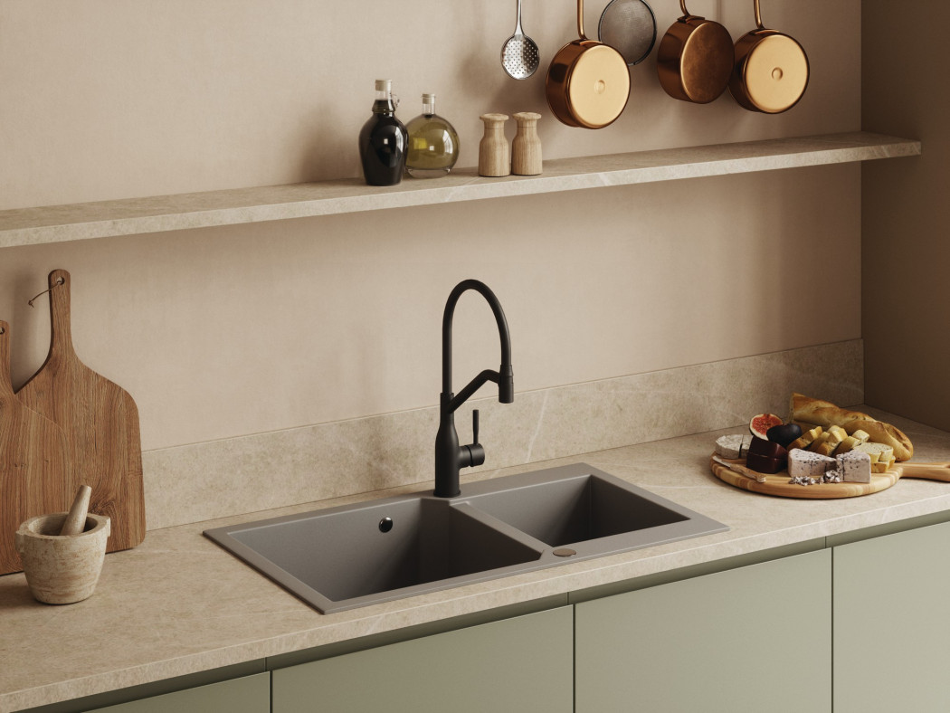 Dwukomorowy zlewozmywak granitowy Milos od Laveo (86×50 cm) łączy nowoczesny design z wyjątkową trwałością: odporny na rysy, uderzenia, przebarwienia i temperatury do 250 °C. Obie komory (głębokie na 20 cm) – większa do dużych garnków, mniejsza do płukania. Odwracalny montaż, korek automatyczny, syfon SpaceSaving i gotowe przyłącze do zmywarki to funkcjonalność i elegancja.