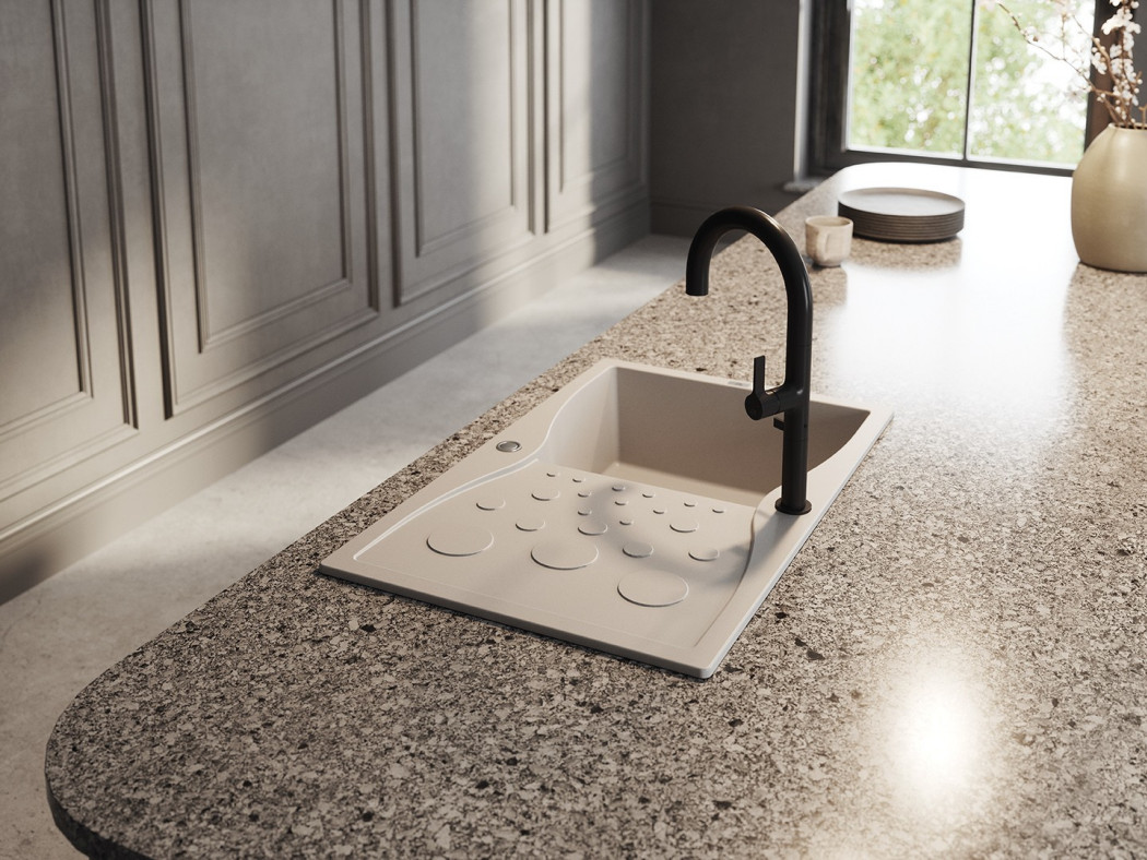 Granitowy zlewozmywak Molokin od Laveo to funkcjonalność i styl w jednym. Model jednokomorowy z odwracalnym ociekaczem zdobi unikalny wzór z kółek, który nie tylko przyciąga wzrok, ale i skutecznie spływa wodą – szybkie osuszenie i większa higiena każdego dnia. Wytrzymały granit, głęboka komora i syfon Space Saving gwarantują wygodę i trwałość.