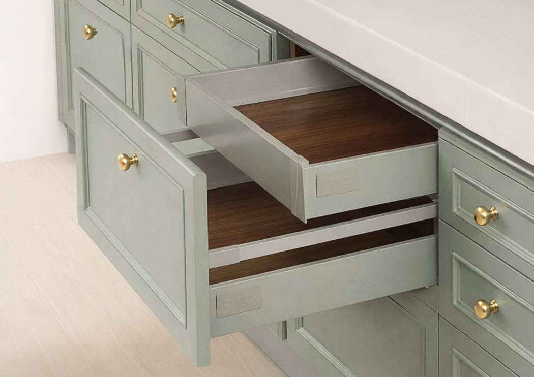 Pełny wysuw, cichy domyk i wysoka nośność (40 kg) gwarantują wygodne, ciche użytkowanie na lata. Do wyższych szuflad można dodać relingi prostokątne lub okrągłe, a opcjonalna mata antypoślizgowa zwiększa bezpieczeństwo przechowywanych przedmiotów. Do wyboru są modele frontowe i wewnętrzne, również ze szklanymi wstawkami bocznymi. System dostępny jest w dwóch kolorach (biel, szarość).