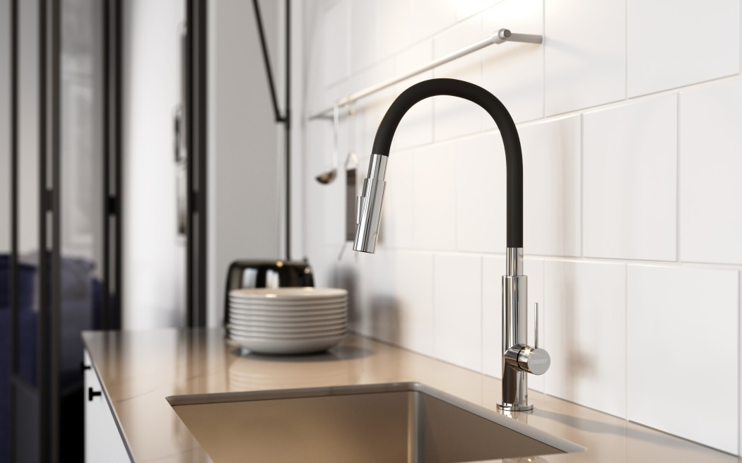 Bateria wyposażona została w czarną, elastyczną wylewkę – można ją wyginać, formować w dowolne kształty, by dotrzeć do wszystkich zakamarków zmywanych naczyń.