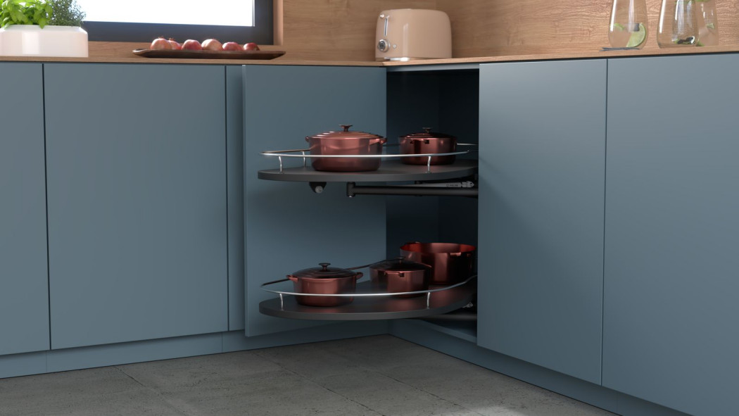 Składający się z dwóch ruchomych półek system Corner Optima ułatwia korzystanie z kuchennych szafek narożnych i zwiększa dostęp do przechowywanych w nich produktów. Półki są odpowiednio wyprofilowane i wysuwają się niezależnie od siebie. Otoczone są niewysokim relingiem, który zabezpiecza rzeczy przed zsunięciem się i upadkiem. Wytrzymałe prowadnice pozwalają na obciążenie każdej półki do 15 kg.