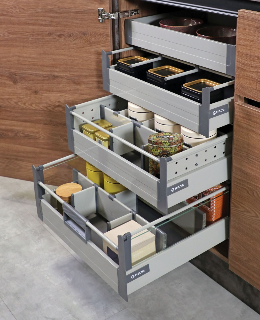 REJS proponuje dwa systemy szuflad Comfort Box i charakteryzujące się cienkimi ściankami Slim Box. Dostępne są w kilku wysokościach i głębokościach – ich szerokość wybieramy sami.