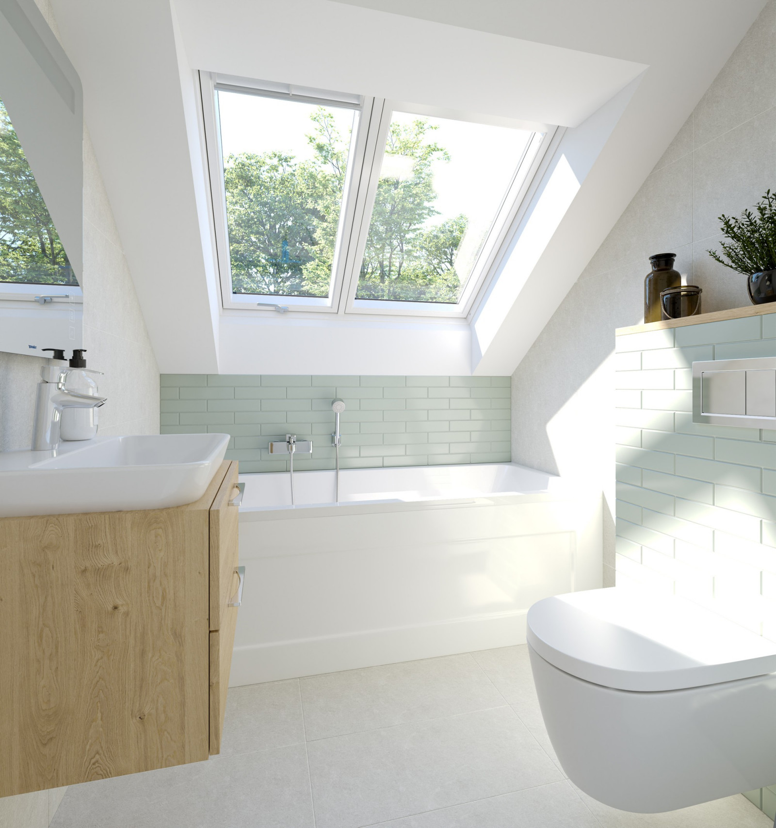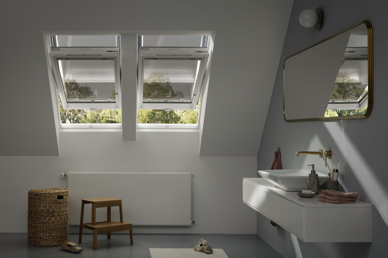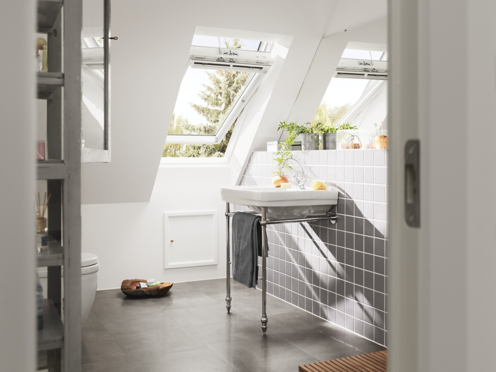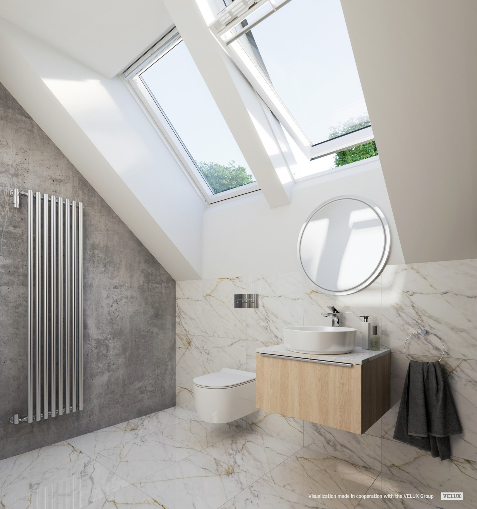 W łazience panuje wilgoć i zmienne temperatury, dlatego kluczowy jest materiał, z którego wykonane są okna dachowe. Dobrym wyborem są drewniano-poliuretanowe okna dachowe VELUX GLU. Dlaczego?