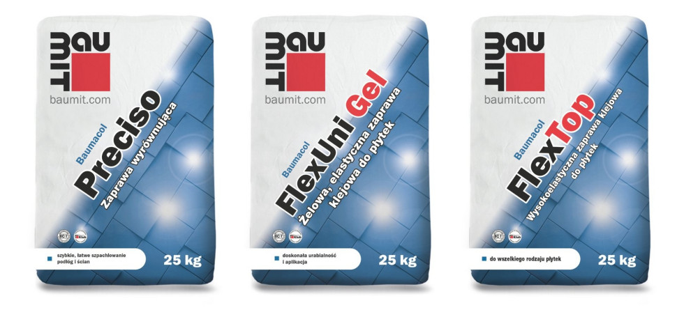 - Baumit Baumacol FlexUni (C2TE) - elastyczny klej dedykowany mniejszym i średnim płytkom, który dobrze radzi sobie z obciążeniami mechanicznymi i termicznymi,
