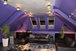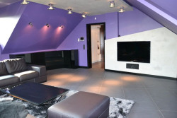 - W pokoju z TV – fioletową farbą akrylowo-lateksową.