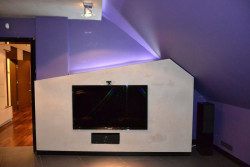 - W pokoju z multimediami – ścianka z telewizorem i podwieszany sufit wykończone masą gipsową, imitującą surowy beton.