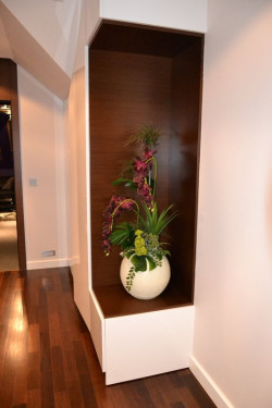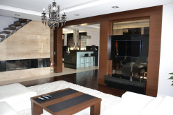 | Ścianka z telewizorem celowo wyglądem naśladuje kominek | Fragmenty ścian obłożono okładziną z fornirem drewnianym (wenge) |