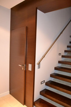- w salonie, jadalni i na poddaszu – okładzina z płyt MDF z fornirem drewnianym wenge (pasiak), identyczna jak na drzwiach i meblach.
